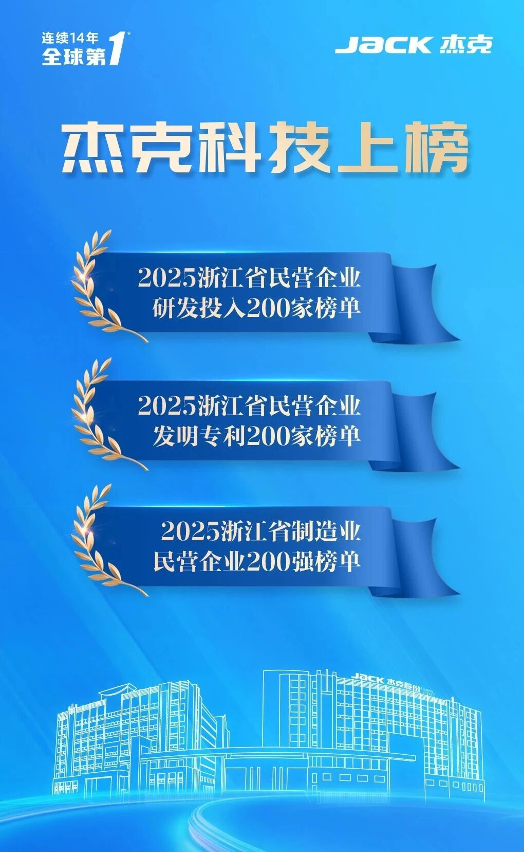 12月5日,浙江省工商联、浙商总会发布了2025浙江省制造业民营企业200强等系列榜单。杰克凭借综合实力与创新成果,成功入围2025浙江省制造业民营企业200强、2025浙江省民营企业研发投入200家及民营企业发明专利200家三项榜单。