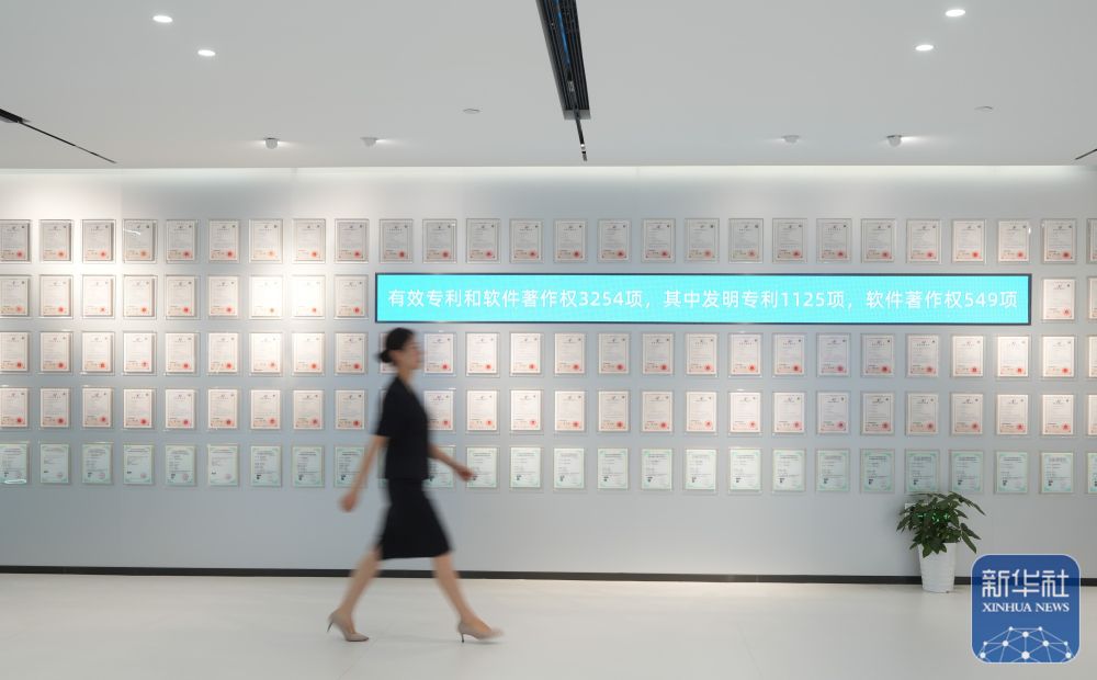 7月18日,在位于台州的杰克科技股份有限公司总部,工作人员走过公司的专利墙。