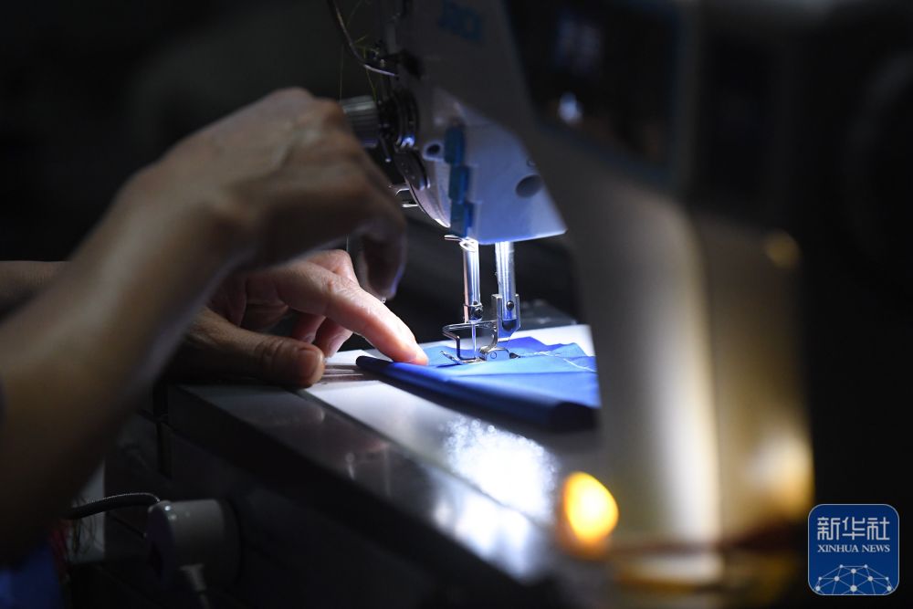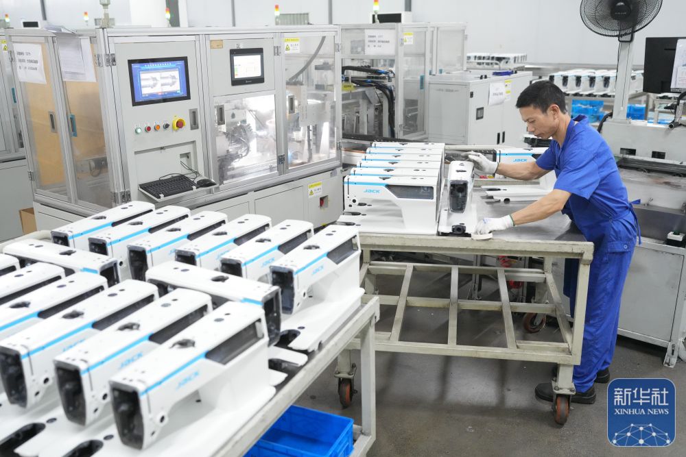 7月17日,在杰克科技股份有限公司台州湾工厂,工人对智能缝纫机进行出厂前的性能测试。