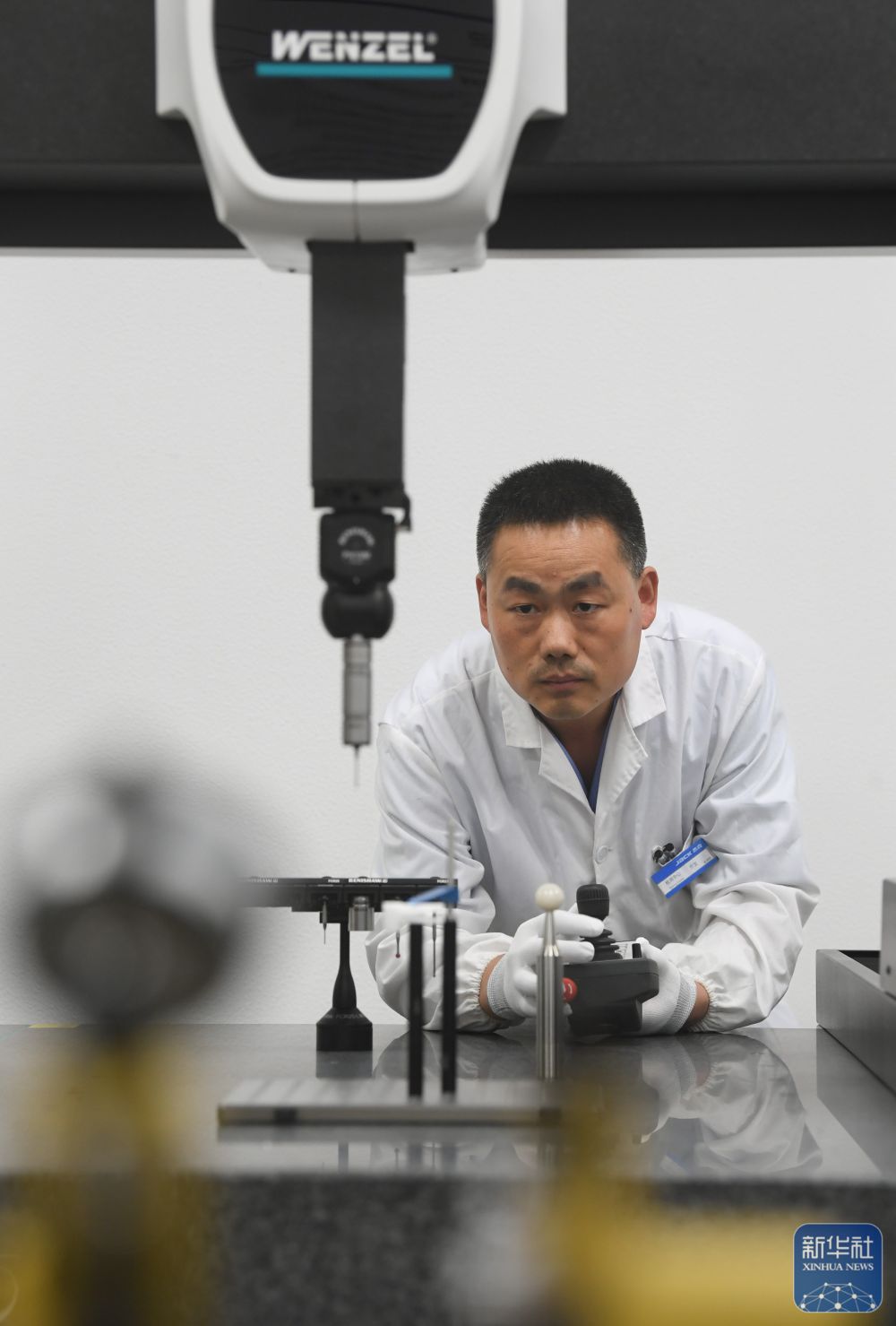 7月17日,在位于台州的杰克科技股份有限公司总部,实验室工程师利用三次元测量仪检测智能缝纫机精密零件。