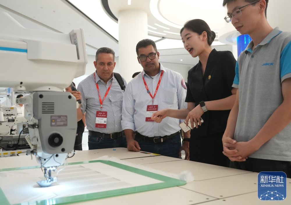 7月18日,在位于台州的杰克科技股份有限公司总部,工作人员向外籍客商介绍公司的智能缝纫设备。