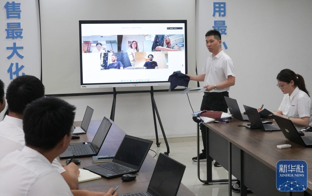 7月17日,在位于台州的杰克科技股份有限公司总部,中方研发人员和意大利分公司的工程师视频连线,收集新款贴袋机的海外用户反馈。