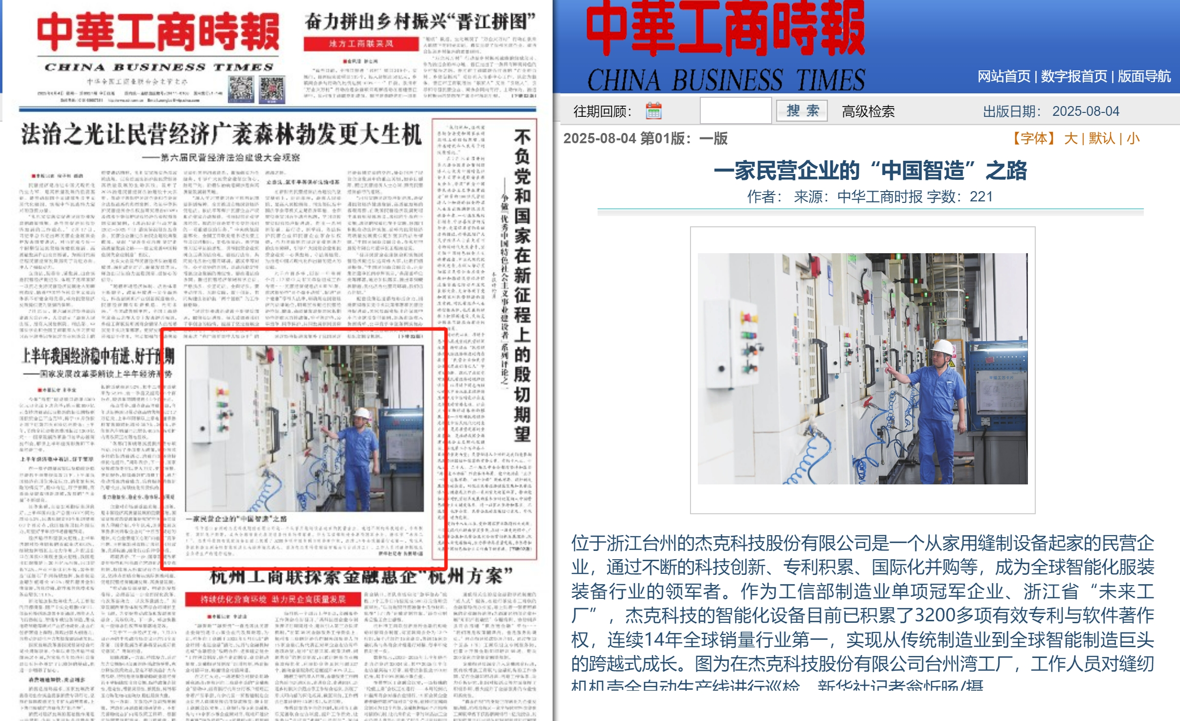 作为工信部制造业单项冠军企业、浙江省“未来工厂”,杰克科技的智能化设备目前已积累了3200多项有效专利与软件著作权,连续14年全球销量行业第一,实现从传统制造业到全球智能制造巨头的跨越式成长。