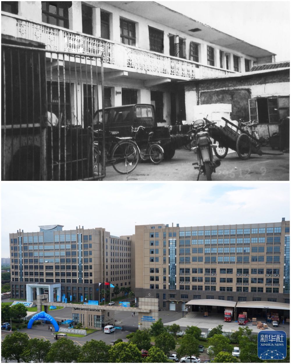 这是一张拼版照片。上图为:1995年杰克创立时的厂区景象(资料照片);下图为:杰克科技股份有限公司总部的外景(2025年7月17日摄,新华社记者翁忻旸摄)。