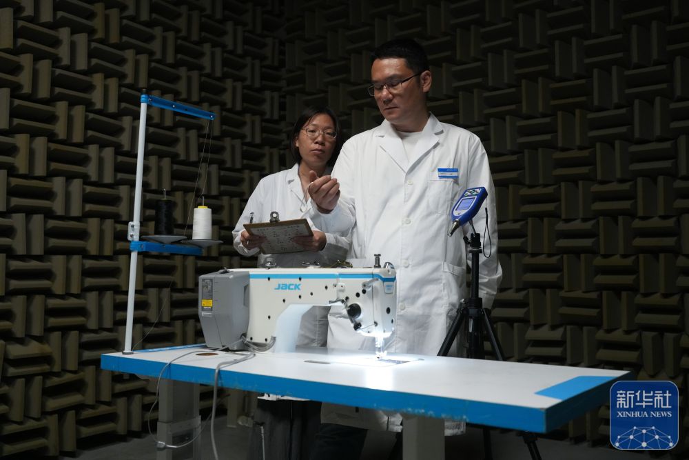 7月17日,在位于台州的杰克科技股份有限公司总部,实验室工程师在半消音室检测智能缝纫机噪声。