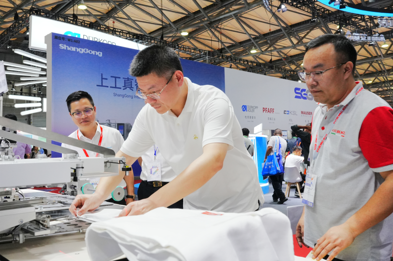 李昌明兴致勃勃地观看了公司最新推出的系列创新产品。他详细了解了AI缝纫机的智能化性能与应用前景,观摩了奔马S90 PRO全裁大师高效精准的裁剪演示,并对威比玛V6快反贴袋机的柔性化生产能力表示赞许。