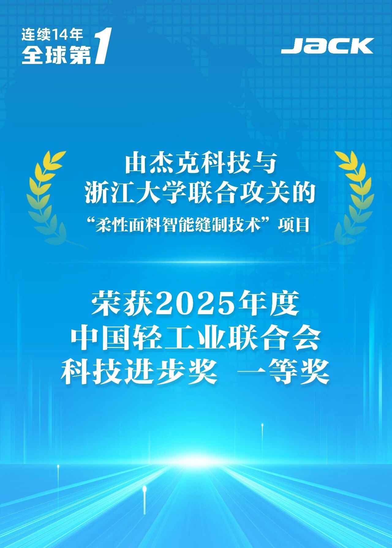 近日,备受瞩目的“2025年度中国轻工业联合会科技进步奖”获奖名单公布。杰克科技与浙江大学联合攻关的“柔性面料智能缝制技术”项目荣获一等奖,再度彰显了杰克在缝制装备领域的卓越科研实力与前沿引领地位。