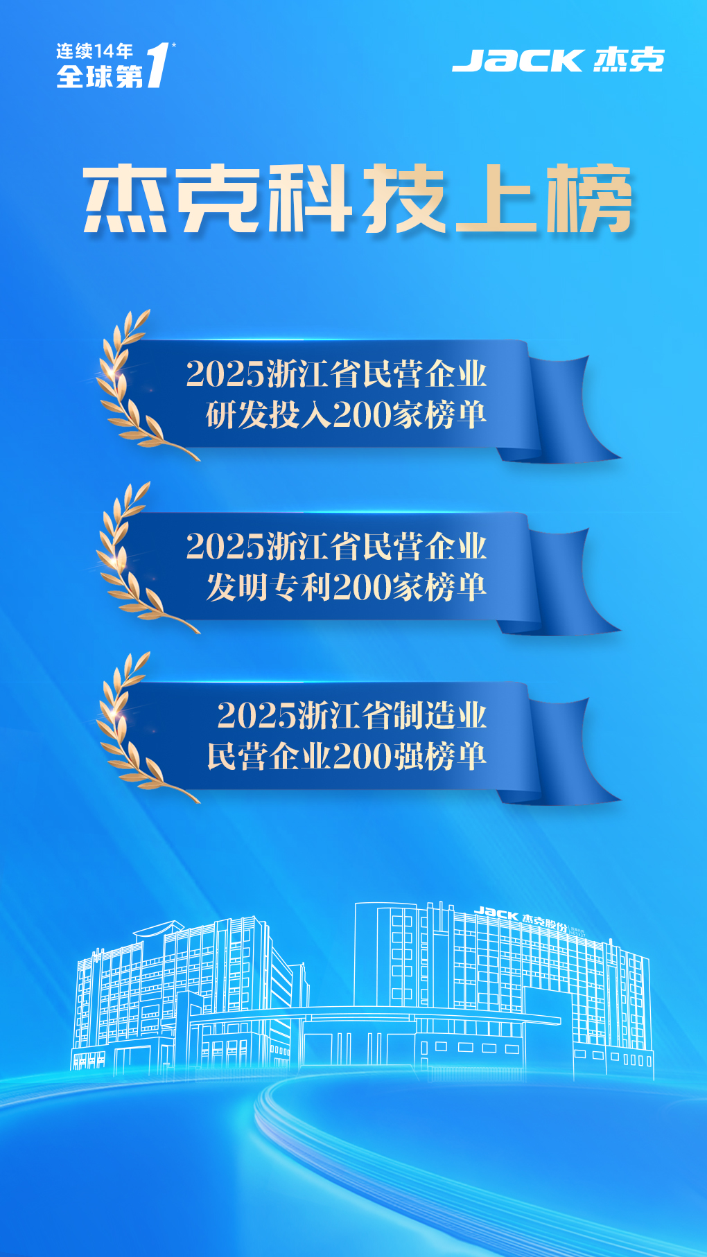 2025-12-10杰克凭借综合实力与创新成果,成功入围2025浙江省制造业民营企业200强、2025浙江省民营企业研发投入200家及民营企业发明专利200家三项榜单。